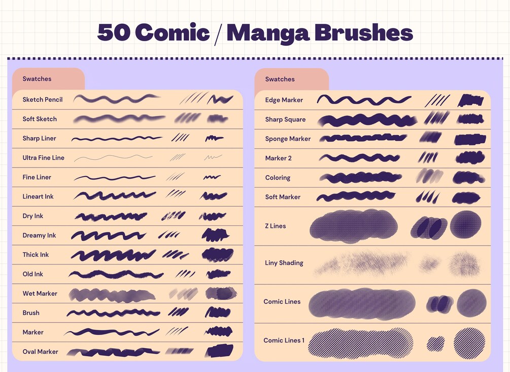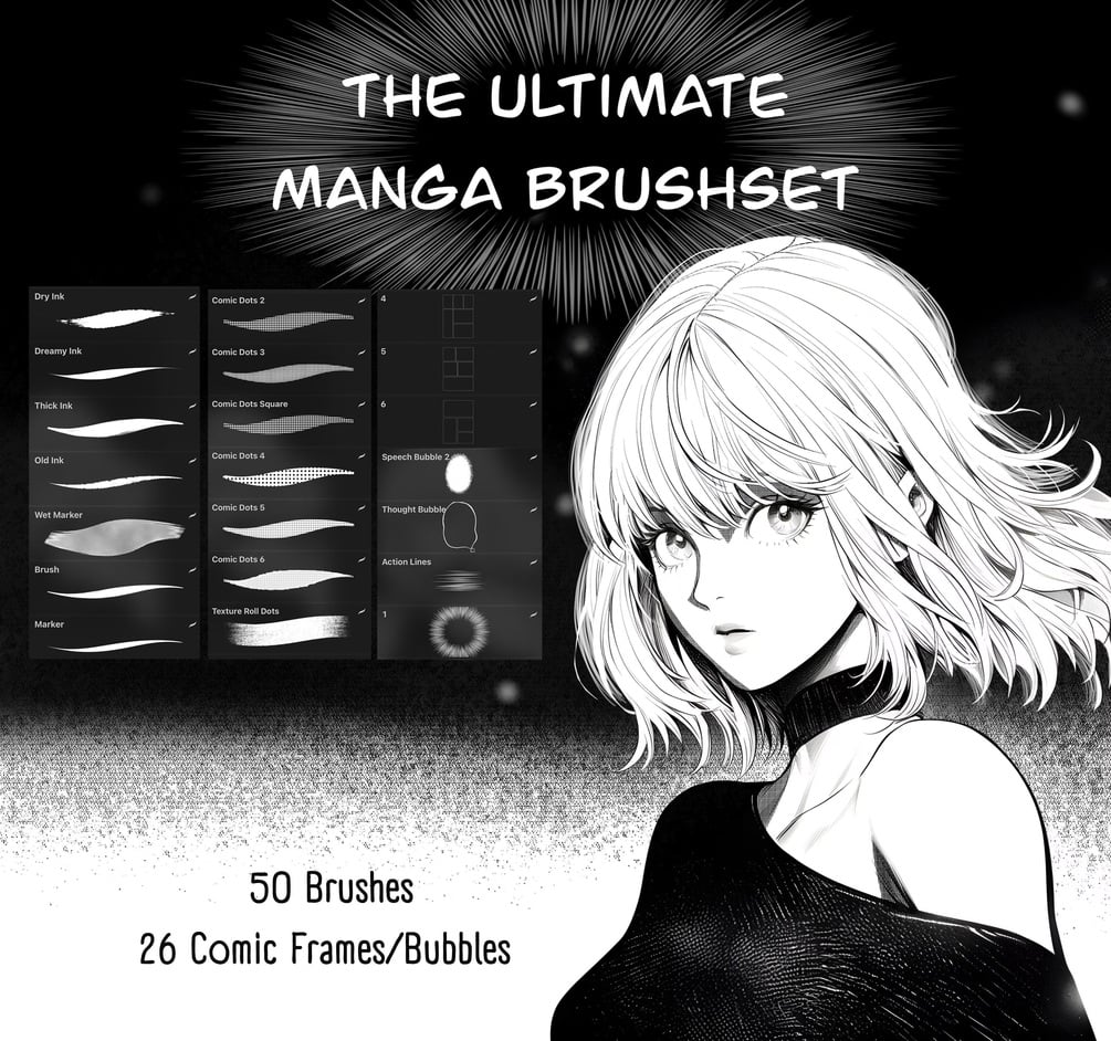 50 Manga Brushes, 10 Comic Frames & 10 Speechbubble Stamps for Procreate